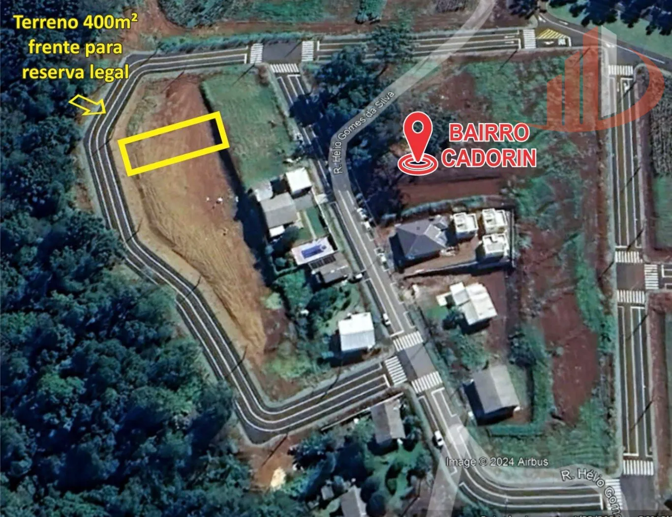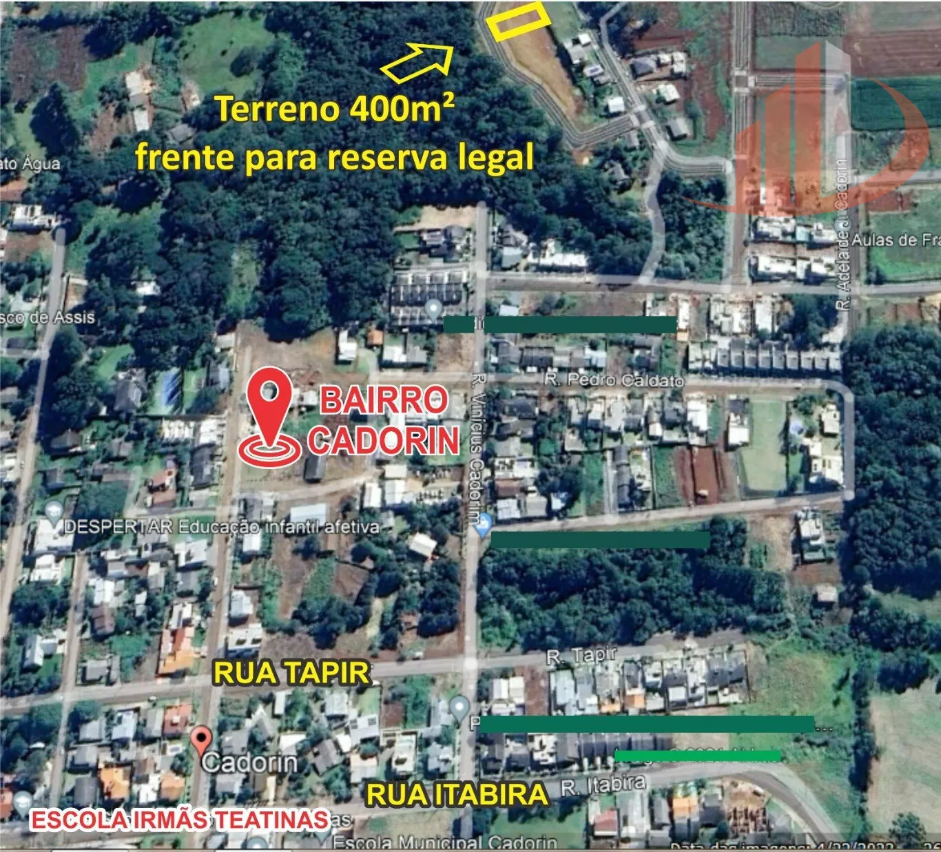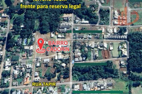 Terreno no alto do Cadorin, com 400m², plano, acima do nível da rua, área de preservação permanente em frente, asfalto novo, por não ter ruas pra frente a circulação é maioria de moradores, local tranquilo e de muita valorização.