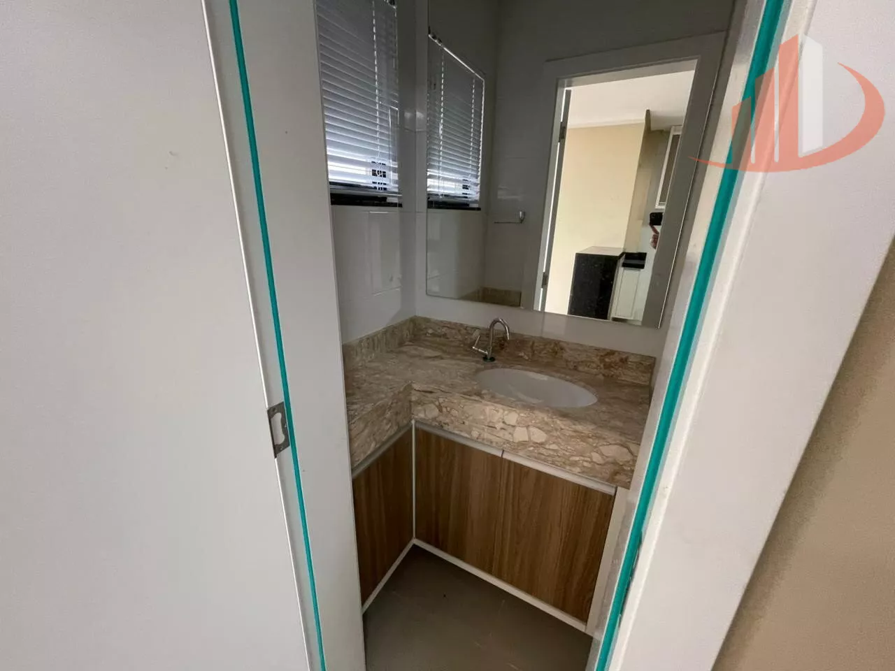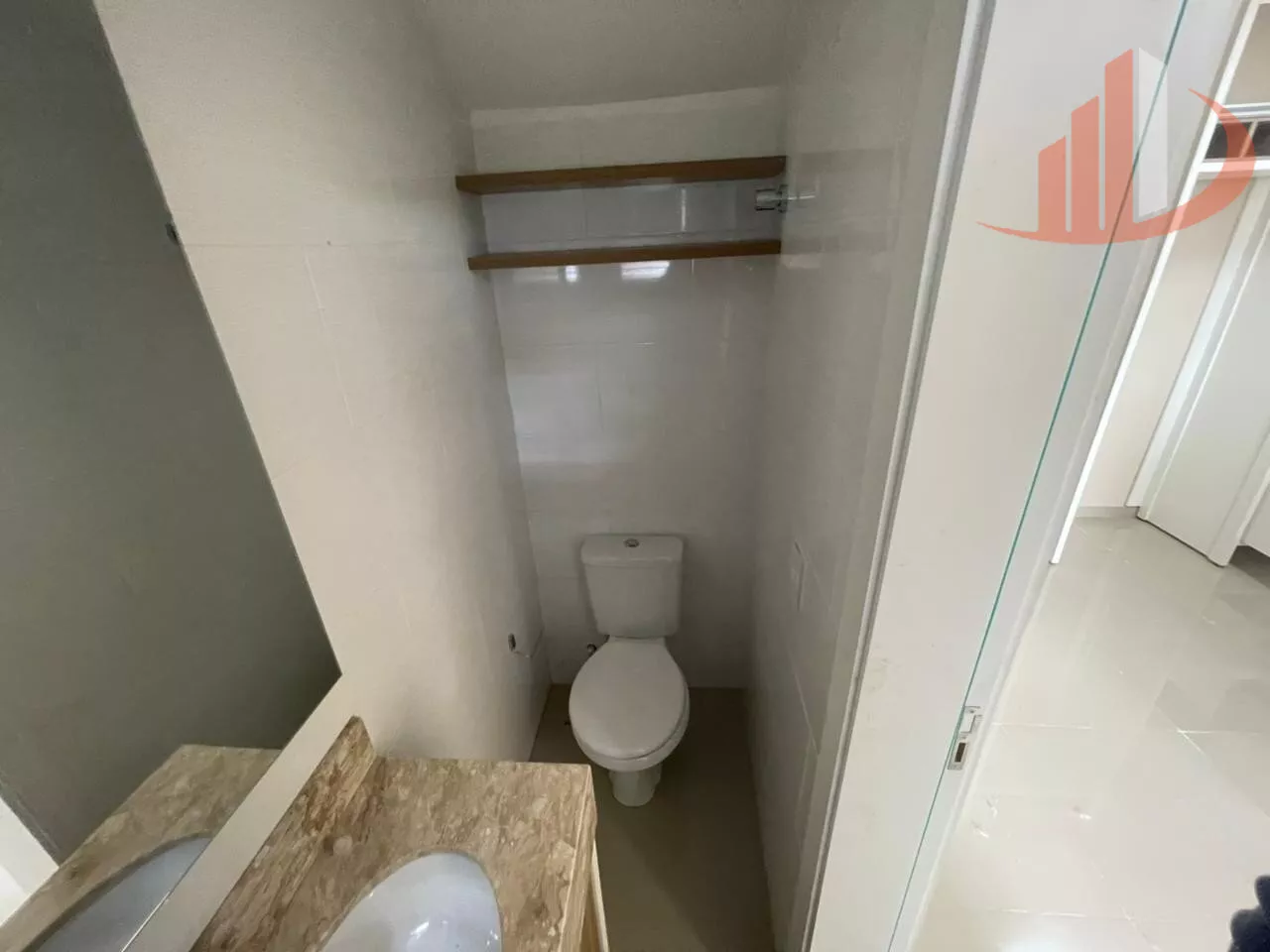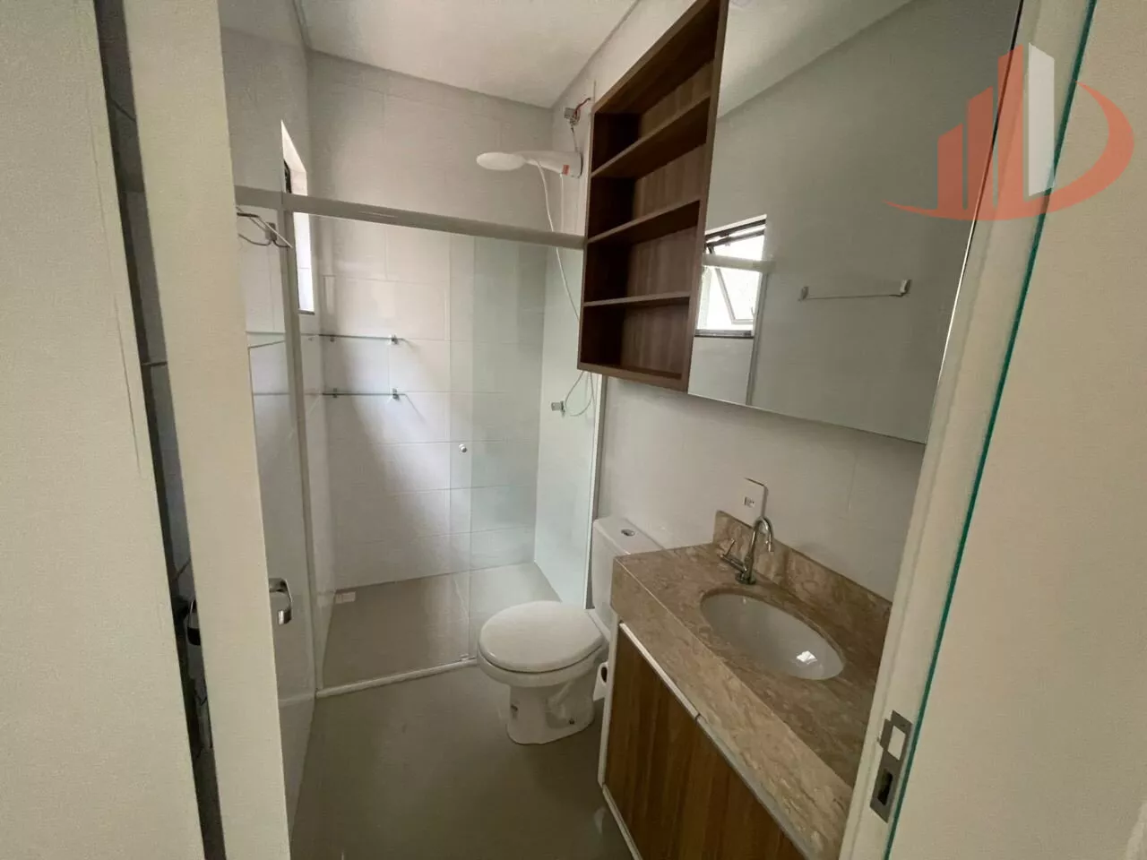 Lavabo + banheiro social completo com box de vidro, armários e chuveiro instalado